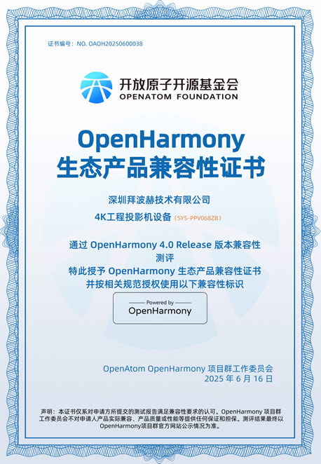 2025年6月16日,高端视效领域迎来技术突破——拜波赫三原色4K工程投影机完成华为OpenHarmony 4.0 Release认证,成为全球首款接入鸿蒙生态的专业工程投影设备。在超过406家鸿蒙生态企业中,拜波赫凭借工业级可靠性与分布式协同能力率先打通专业视听设备与国产操作系统的技术壁垒。
